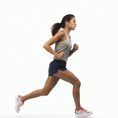 a girl, muscular legs, running, on the white sand beach, Close up shot, Sandy feet running through the shallow water, blue sky, photorealistc, extreme detail, mega pixel, Taken using a Canon EOS R5 moonlight 50mm lens --v 6.0 --s 750