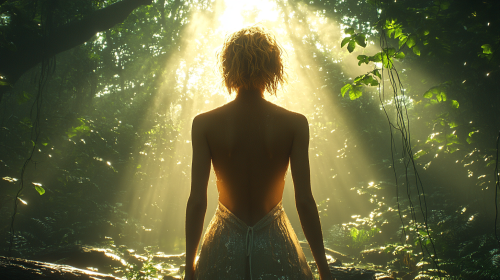 A tense 3D scene, photorealistic, 16:9 aspect ratio. A dark shadow of a woman with short blond hair, in a sun dress stands, their back to the camera, body language rigid with shock. The scene is deep in a misty Amazon jungle at dusk. A narrow clearing surrounded by dense, towering trees. Shafts of fading sunlight pierce through the canopy, creating dappled shadows. In the foreground, a fallen tree trunk partially blocks the view. Vines hang ominously in the foreground, framing the scene. The color palette is rich greens and deep shadows, with hints of orange from the setting sun. Ominous. Hyper detailed. --ar 16:9 --s 750
