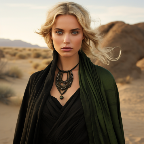 blond woman, green eyes, raven dress,cross earring, desert in the background