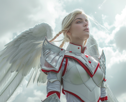 Full-body photograph of an attractive woman with blonde hair and blue eyes, wearing white, tight-fitting armor with silver-blue trim and large angel wings on her back. The background depicts mountain sunset with warm lighting. The image was captured using a Canon EOS R6 Mark II Mirrorless camera, shot from the front. --ar 16:13 --v 6.0