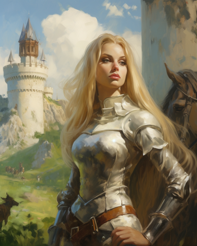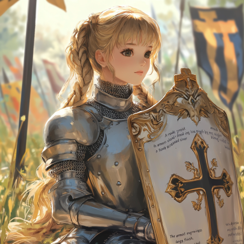 "anime A regal young female knight with long, flowing blonde hair styled in a braid, dressed in intricately designed silver armor, sits confidently. The armor is adorned with ornate engravings and has a polished, reflective finish. She holds a large, decorated shield with gold crosses and medieval symbols.Lively field field.look up at the sky. Her expression is serene yet resolute, her gaze slightly if in big smile look up at the skyin a big way. The background is filled with medieval banners and a blurred battlefield scene, capturing the atmosphere of an epic historical moment. The lighting is soft, with sunlight filtering through, highlighting the intricate details of her armor and the soft texture of her hair.8k".Fullbody 128k Bluray Extreme UHD 8K High quality anime image .--niji5