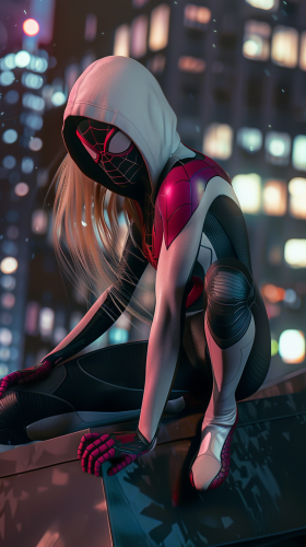 A photorealistic full-body Spider-Gwen, unmasked, perched on the edge of a New York rooftop at night. Her face shows focus and determination, with her blonde hair flowing slightly in the wind. Her iconic white, black, and pink suit stands out against the glowing city lights in the background. Cinematic lighting, photorealistic textures, hd quality --ar 9:16 --v 6.0 --s 50 --style raw
