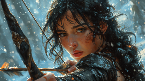 atremis goddess in action, comic book art, black assasin armor, ethereal, vibrant, mysterious, sharp, bow and arrow, highly detailed, highres, dark fantasy, intense lighting, professional, mythical, dynamic pose, dramatic shadows, powerful, sleek design. --style raw --ar 16:9 --s 750 --v 6.0