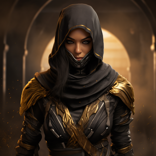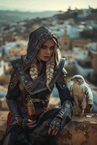 Stunning photograph, a beautiful blonde assassin with her hair in a braid, wearing black assassin’s armor and hood in the style of Assassin’s Creed. She is sitting on a roof with a bottle of rum in her hands. There is a beautiful white hawk perched next to her. The view in the background is a Moroccan city. photorealistic, Canon EOS 5D Mark IV style, 50mm lens effect, golden hour, high saturation, high contrast, HDR processing, vignette effect --ar 2:3 --style raw --v 6.0
