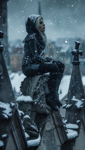A beautiful blonde female assassin wearing black leather armor and hood in the style of Assassin’s Creed sitting high above the town on the head of a gargoyle on the roof of a Gothic cathedral, looking up at in the sky, giant snowflakes falling from the sky, photorealistic, Canon EOS 5D Mark IV style, 50mm lens effect, golden hour, high saturation, high contrast, HDR processing, vignette effect --ar 2:3 --style raw --v 6.0