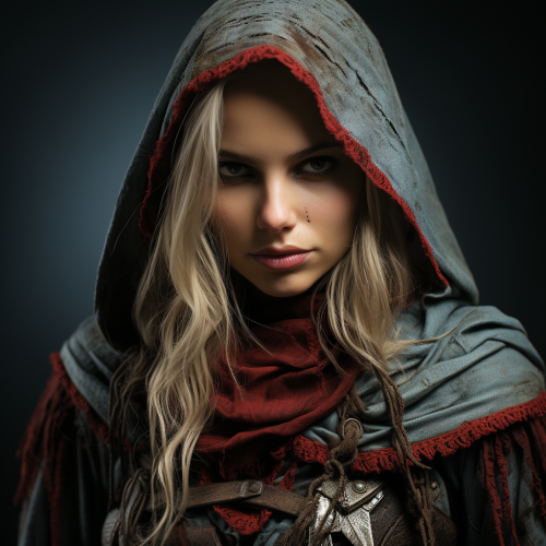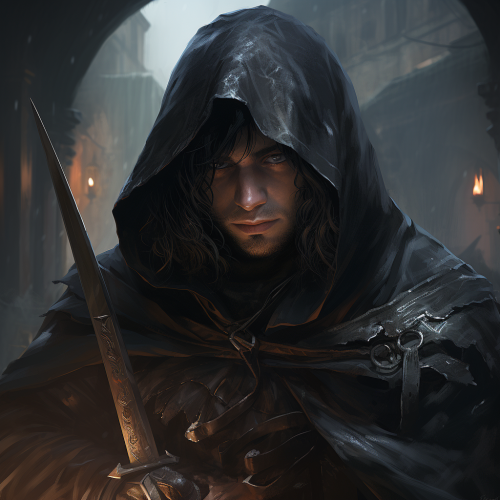 Fiddler; a medium skinned assassin with long black hair, wearing a leather armor top and black hooded cape wielding two daggers --s 250