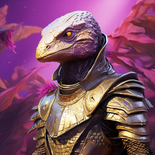 humanoid lizard wearing golden assassin armor, moebius style, purple cactus background --v 5.2