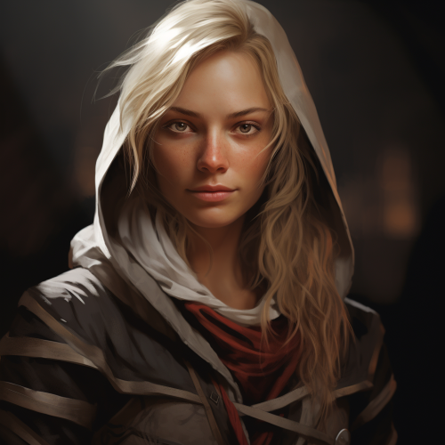 a blonde frontal portrait of a female blonde character inspired by the game assassins creed