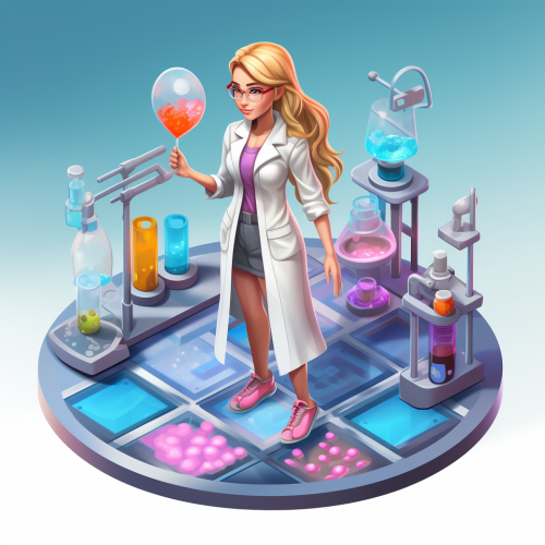 2.5d video game character render, blonde woman in a lab coat, isometric perspective, colorful