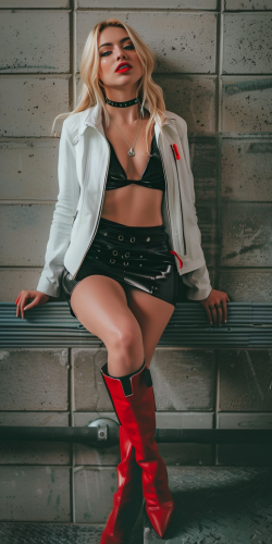 realistic photo, ultra realistic, female super villain, full body, feminine, beautiful face, smirk, muscular figure, toned abs, wide hips, mischievous smile, detailed blonde hair, vivid red boots, tight black miniskirt, white leather jacket, candid photography --ar 1:2