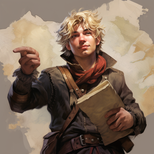 male pirate, blonde hair, cartographer, aventure, researcher, character, D&D, carton, curious and excited