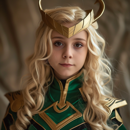 A blonde haired girl with brown eyes dressed as the god of mischief Loki --v 6.0 --ar 1:1