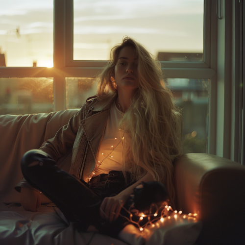 a photograph of a beautiful long haired blonde young woman seated on a sofa in an English flat with sunset showing in the windows behind her,she is wearing a blank leather jacket and a white tee shirt and leather trousers and she has some fairy lights draped across her leg and over her shoulder, the photograph has a high fashion grimy chic sheen like the photographs of Juergen Teller ,Contax T2 camera and colour film