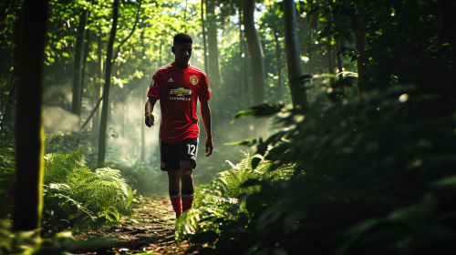 ultrawide-angle photography of Marcus Rashford dressed in a Manchester United kit, wandering the forests Narnia, Cinematic, Kodak Ektar, Colorful, Saturated, Technicolor, 2.5D, Ultra-HD, AMOLED, Hard Lighting, Ray Traced, Ray Tracing Ambient Occlusion, Anti-Aliasing, FXAA, RTX, SSAO, De-Noise, Tone Mapping, insanely detailed and intricate, hypermaximalist, elegant, ornate, hyper realistic, super detailed, --v 6.0 --ar 16:9 --style raw --s 50