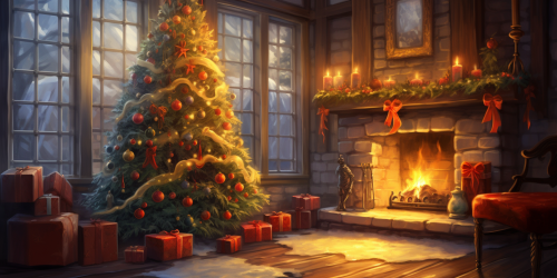 very close-up image of zoomed-in on a fireplace in a cozy living room with christmas decorations all around and a roaring fire in the fireplace, style is hyper-realistic, photorealistic --ar 16:9