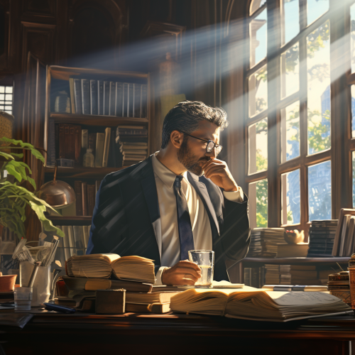 lawyer in taking a sip from his coffee at his desk full of papers and lawbooks in an old office with bookcases that is lit by the sunlight through the window, realistic, portrait