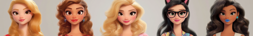 portraits headshots from waist up of seven disney princesses animation style photog. First one has shoulder length blonde hair, red lips and is wearing a red gown. Second one has big lashes, super long brown hair and smiling with beautiful teeth. Third one has shoulder length brown hair, black frame glasses. Fourth one has long blonde hair, long lashes . Fifth one has long curly wavy blonde hair and is wearing a colorful kimono and has a blue diamond as a lip piercing above her upper lip. Sixth one has long brown hair, wearing a catlike black frame glasses. Seventh one has nice long lashes, shoulder length hair with two blonde stripes. Seventh one --ar 7:1