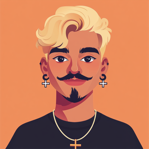 a vectorial person that has a blonde hair dyed with a moustache, chinese-like eyes but latino, and dressed with oversized clothes mostly black and with something that is related to a graphic designer, bigger nose, cross earrings, smiling
