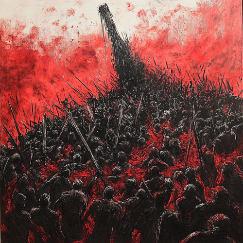 Knitted silk :: Painting over silk :: Psychological surreal profile of Huitzilopochtli + Halftone pattern + editorial illustration of the + higly textured, genre defining mixed media collage painting + fringe absurdism + Award winning halftone pattern illustration + simple flowing shapes + subtle shadows + paper texture + minimalist color scheme inspired by aztec culture --ar 1:2 --v 5.2