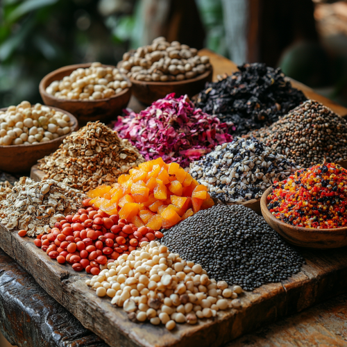 create a picture with alcaline foods looking very healthy in the jungle, make legumes, fruits,seed and nuts. warm tones indigenous style --s 750 --style raw