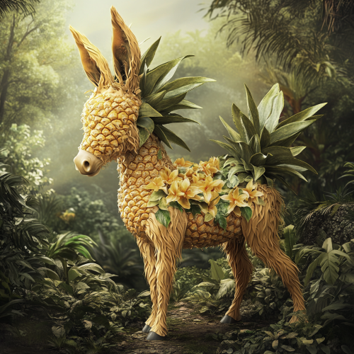 A whimsical fusion between a pineapple and a donkey. The body and shape of a donkey but with the texture of a pineapple skin covering its body, large pineapple leaves sprouting from its mane and tail. Its fur subtly transitions into the color of ripe pineapple, with intricate golden and green tones. The ears resemble the rough texture of pineapple leaves, while the donkey stands in a lush tropical environment. The background features a vibrant jungle with tropical trees and sunlight filtering through. Style this as a playful, surreal artwork with light-hearted charm –ar 16:9 –chaos 30 –quality 2 –style scenic –s 700 –no harsh lighting --style raw