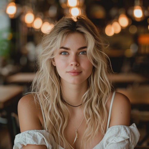 a beautiful woman, 30 years old, light skin and blue eyes, modeling portrait, front profile, white background, blonde hair with a ponytail, a single pearl earring, subtle red lips, smiling, relaxed. --v 6.0