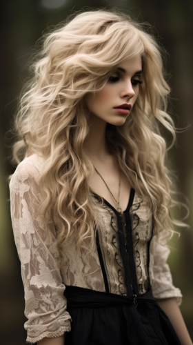 Blonde woman in lace suit, representing aristocracy and steampunk fashion