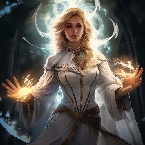 young dark blonde female cleric with white robe casting a radiant healing spell, high detail, high quality, complex design, fantasy, illustrated animation