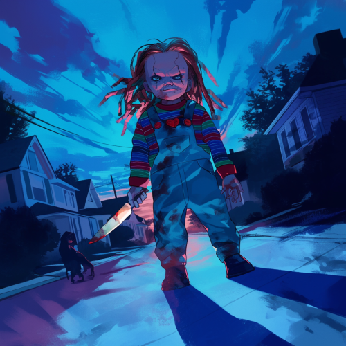 horror film on terror street, expansive view of a scary looking street, black man style chucky doll with long dreads and holding a knife at the end of the street, horror themed street lighting , long shadow on the street coming from the shadow figure, carnage , cd cover style art , nightmare on elm street art design , horror style blue colors --niji 6