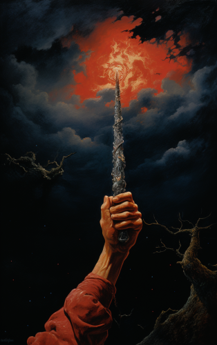 The hand of a man who struck a bloodstained sword high into the dark sky, a movie poster, an oil painting --ar 10:16