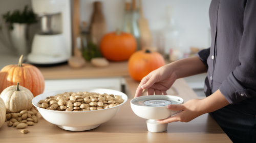 healthy person, in a white kitchen, weighing pumpkin seeds on a food scale in a bowl, thoughtful --ar 16:9