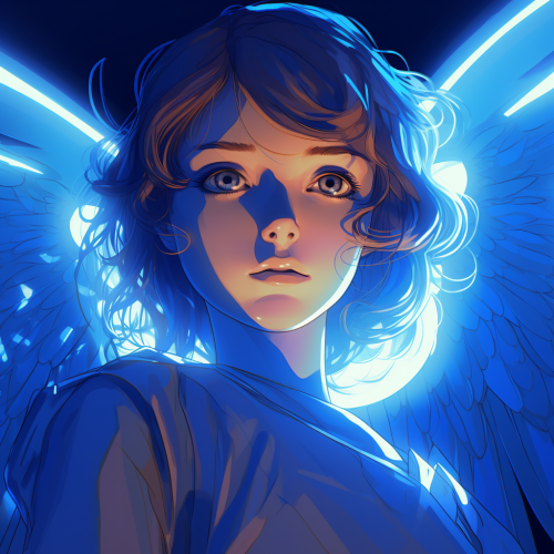glowing angel, deep indigo blue eyes looking cautiously, rotoscope animation, low angle, --style raw --v 5.2