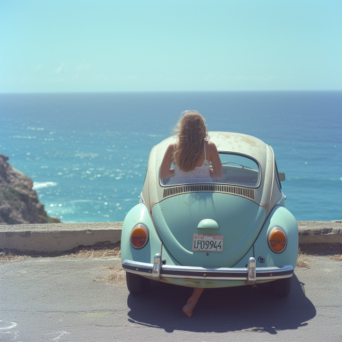 Kodak ULTRAMAX 400, 35mm film photo, volkswagen beetle, beautiful girl, blue sea, --s 250 --v 6.0