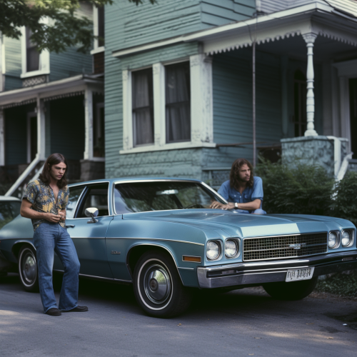 a blue 1973 4-door chevy impala, parked on a corner next to a waist high hedge in a neigborhood of small houses, a portable radio sits on the car's roof as 2 guys with longish hair and tshirts with band logos stand next to the car drinking beer and smoking, one seems upset and has his arms raised evocotivly, in the style of a comic book --v 5.0