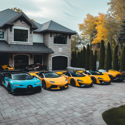 In the picturesque countryside, nestled amidst lush greenery and rolling hills, a wealthy black man enjoys the epitome of luxury at his sprawling mansion, his extensive garage housing an impressive collection of supercars: the sleek Bugatti Chiron, the powerful Lamborghini Aventador SVJ, the timeless Porsche 911 GT3 RS, the futuristic Tesla Model S Plaid, and the exquisite Ferrari 812 Superfast, surrounding him are five of the most stunning black women, each exuding an unparalleled level of beauty and grace, their radiant ebony skin and striking features complement their diverse and fashionable ensembles, they strike a variety of captivating poses on the luxurious supercars, creating an enchanting tableau of allure and sophistication, with poses that range from sensual reclines to confident leans, they enhance the scene's captivating beauty and elegance, making it a visual masterpiece, the black man, surrounded by such captivating beauty and his enviable supercar collection, experiences a life of opulence and refinement that reflects his success and appreciation for beauty and style, all captured with photorealism, hyperrealism, photo taken with Sony a6300, 32k UHD, cinematic color grading, --v 6.0
