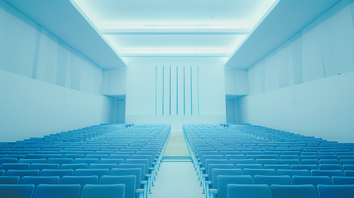 Wide-angle view of a modern auditorium with rows of blue seats, arranged in perfect symmetry. The scene is brightly lit, showcasing the clean, inviting atmosphere of the space. Background features minimalistic walls, focusing on the seating arrangement --ar 16:9 --v 6.0