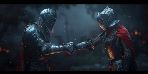 a fantasy style design of a knight and wizard shaking hands, the image is focused on the two hands shaking, time of day is night time, torch light glow on the elements, great shading and lighting on design --v 6.0 --ar 2:1