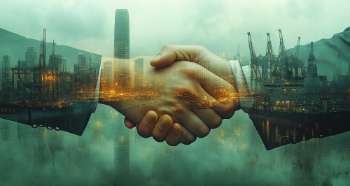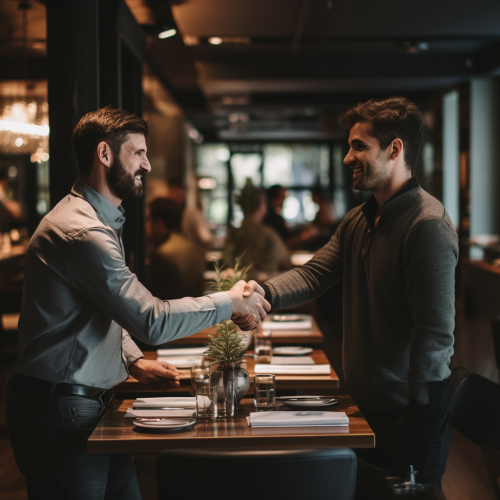 A realistic man smiling confidently, wearing a navy suit with a white shirt, shaking hands with another person in front of a high-end luxury villa. The man's features are sharp and realistic, with subtle lighting highlighting his facial details. The villa is sleek and modern, surrounded by perfectly manicured gardens and a high-end car in the driveway. Style: photorealism, detailed textures, warm lighting, luxury real estate, human realism, natural look, hd quality --ar 16:9 --v 6.0
