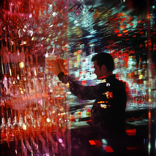 color Photograph of a barman shaking a cocktail in a punk disco , Mario Testino style, mirror, Richard Newton style, Nestor Almendros style, Woody Allen style, dance floor of a punk disco