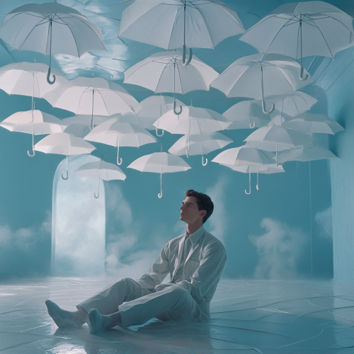 album cover, hipgnosis style, emek style, guy sitting in pale blue room, white umbrellas floating above, foggy floor, detailed photography, --c 5 --v 6.1