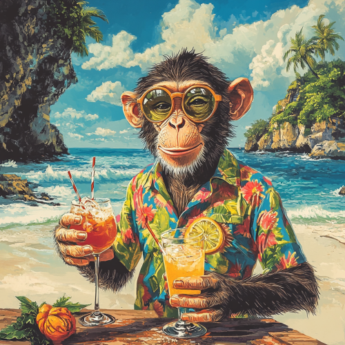An Thai Monkey as a bartender with a cool colorfull shirt shaking some cocktail on a beach with thai cliff on the background with an old school retro style
