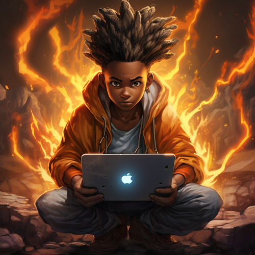 gohan super saiyan 2 surrounded by a yellow energy. He is wearing a purple hoodie and ripped jeans. Use an anime style. Use dark colors with highlights of purple, yellow, and red.