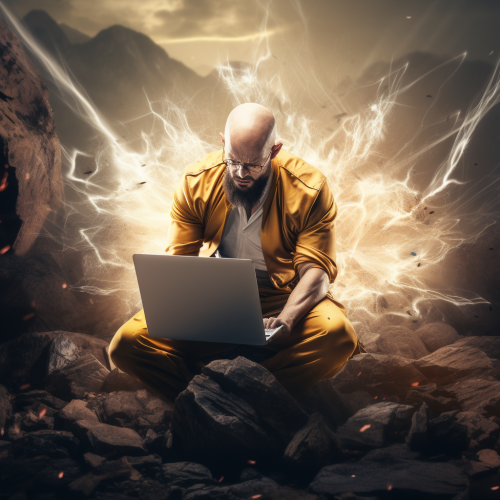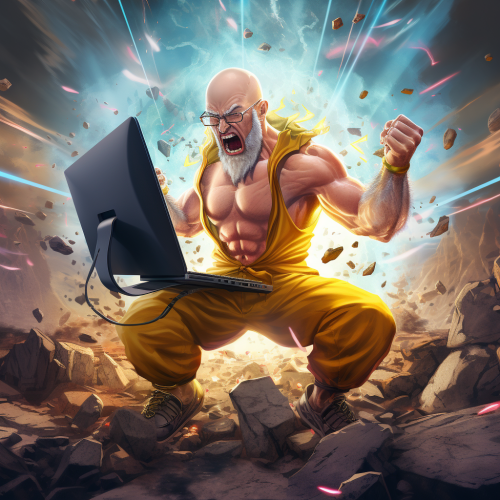 bald man with beard, normal body, transforms into super saiyan, rocks rising from the ground, gaming computer, proton rays, high resolution