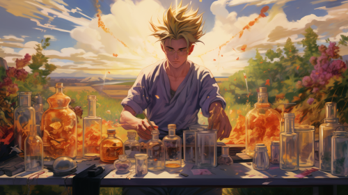 super saiyan Gohan getting high. Smoking and studying marijuana. Taking shots of vodka. Empty Bottles on the table. He is in a lab outside in a garden full of natural light. The room is filled with beakers, flasks, test tubes, and smoke everywhere. --ar 16:9