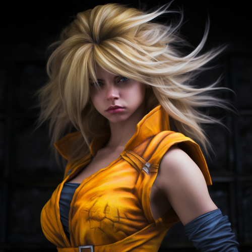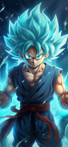 Create an anime-style illustration featuring a powerful, dragonball character with spiky, glowing blue hair, reminiscent of a Super Saiyan transformation. The character should have an intense, determined expression with glowing blue eyes, wearing a metallic, reflective outfit that enhances their futuristic and otherworldly appearance. Surround the character with dynamic energy effects, such as glowing blue and white auras, and shards of light or energy fragments flying around. The background should be dark, contrasting with the bright, vibrant energy emanating from the character, adding depth and intensity to the overall scene. The atmosphere should be dramatic and intense, capturing the essence of an epic, high-energy battle moment.