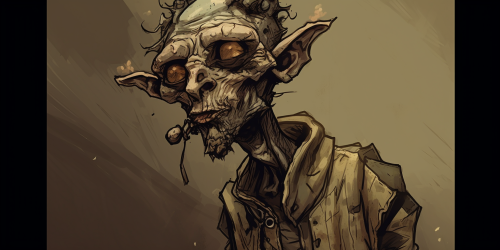 a drawing of a half goblin half man wearing, in the style of decay and decayed, tattered clothes, concept art, dark beige and indigo, backlight, paleocore, folkloric realism, glowing eyes, zombiecore --ar 16:8 --v 5.0