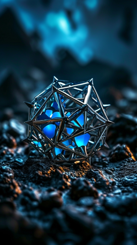 an icosahedron of blue metal triangles, --ar 9:16 --v 6.0