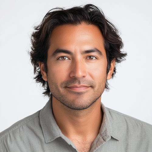 Create a portrait of a Hispanic man in his early 40s with slightly wavy dark brown hair, light stubble, and a friendly expression. He is wearing a casual button-down shirt, with a focused look. The background is solid white, highlighting his artistic nature and hands-on approach