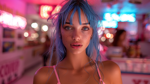 Professional photography, canon 5d mark iv, 50mm, intrinsic details, colorful, some pink neon lights in the background, on a terragen futuristic flea market in the year 3000 new york beautiful nice woman with blue hair and tanned skin in a crazy dance, full body, detail body, detail clothes --ar 16:9 --stylize 1000 --v 6.0