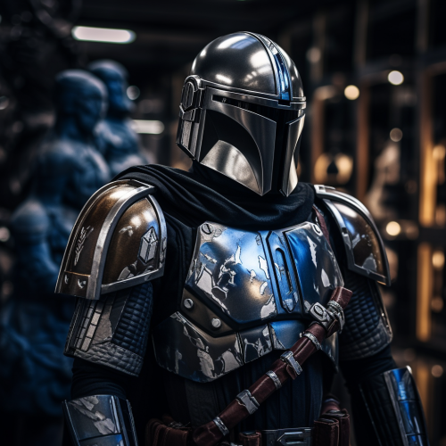 a photo realistic image featuring a full mandalorian armor suit painted with a black, blue and grey theme